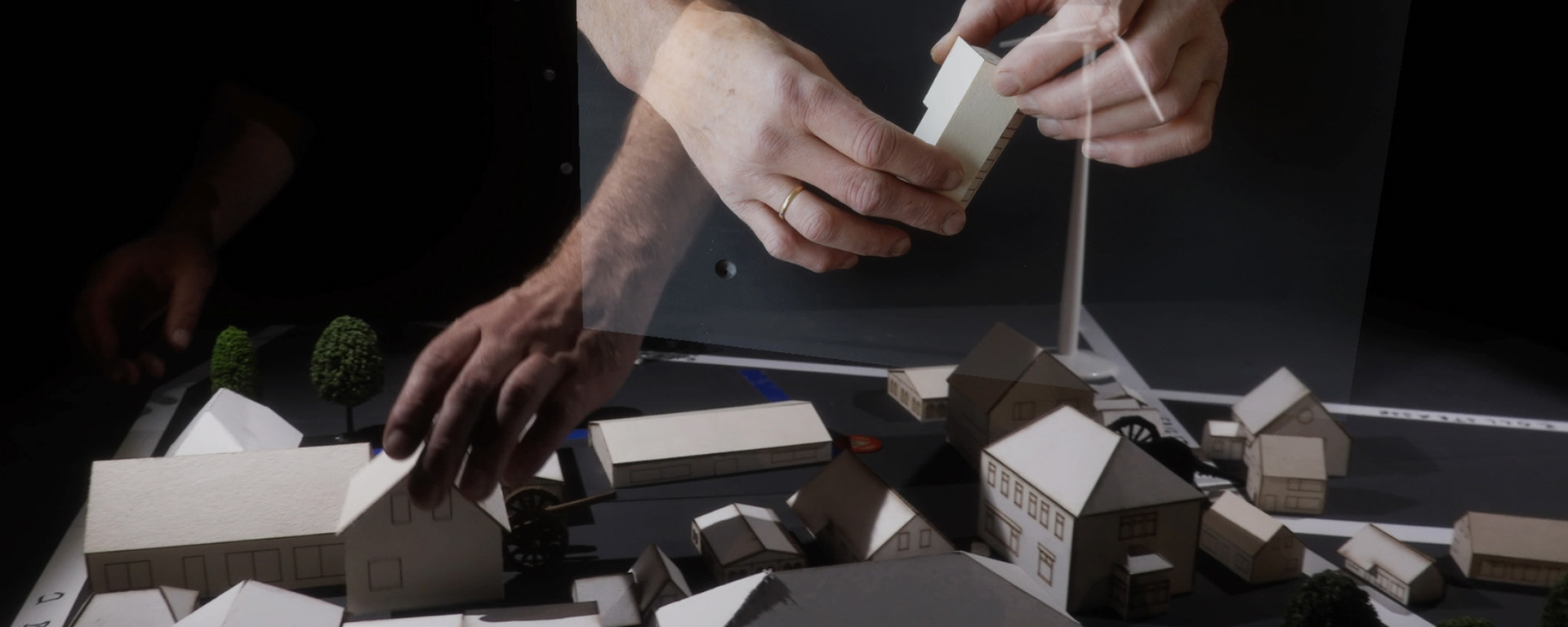 Hands of interviewees holding miniature houses in a video shown in AR above a model