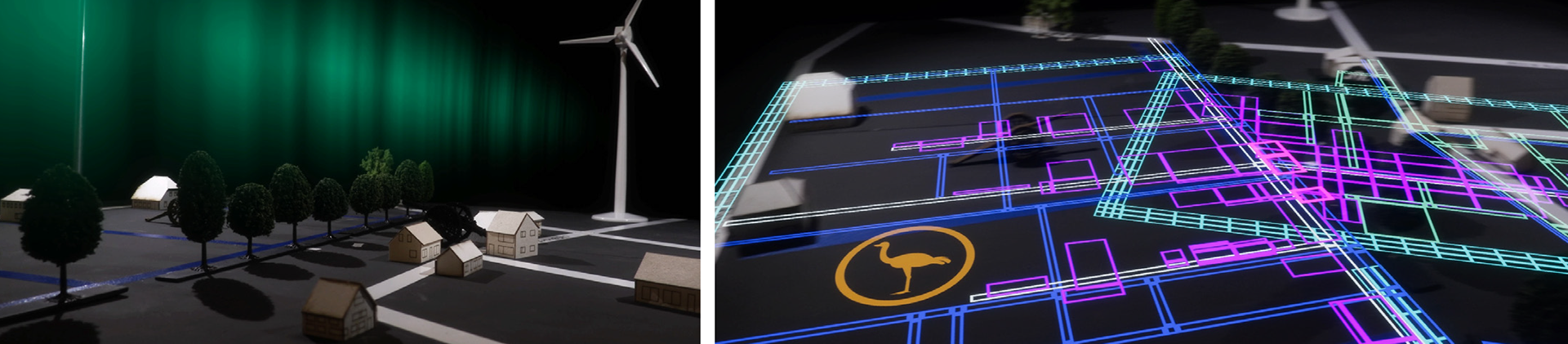 From digital noise (AR), the hand of a performer begins to build a miniature world, house by house.